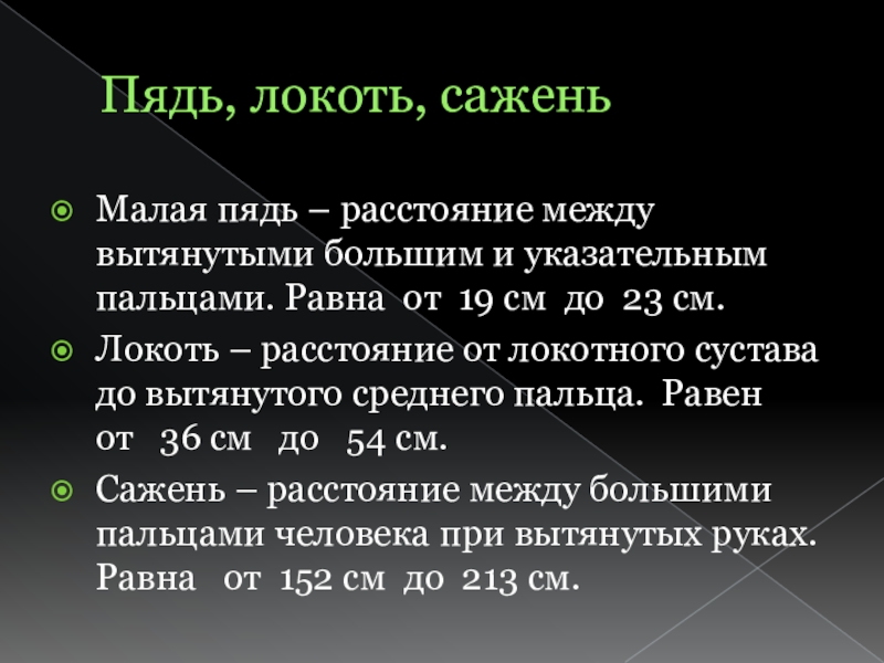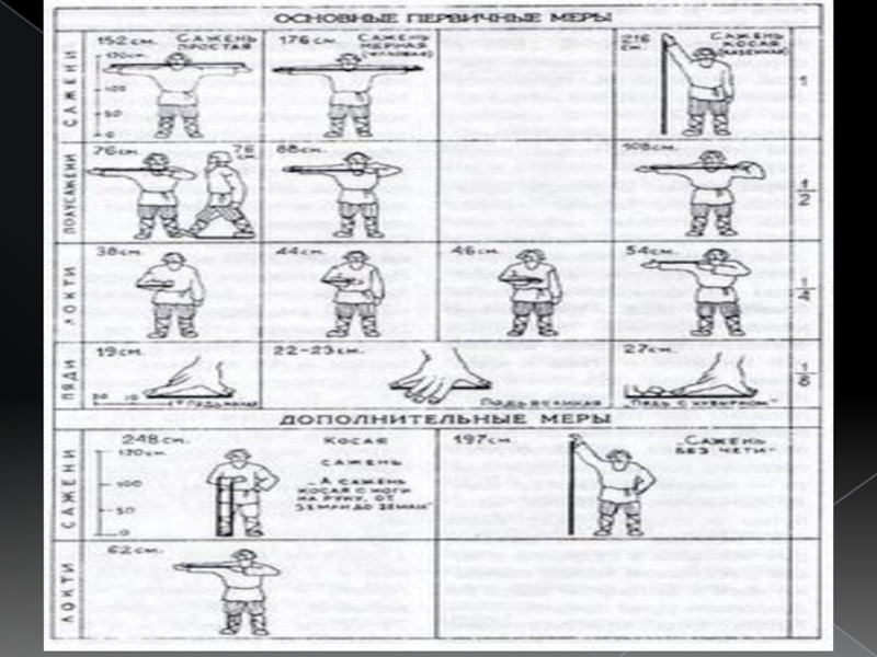 Сажень – расстояние между большими пальцами человека при вытянутых руках. Равна от 152 см до 213 см.