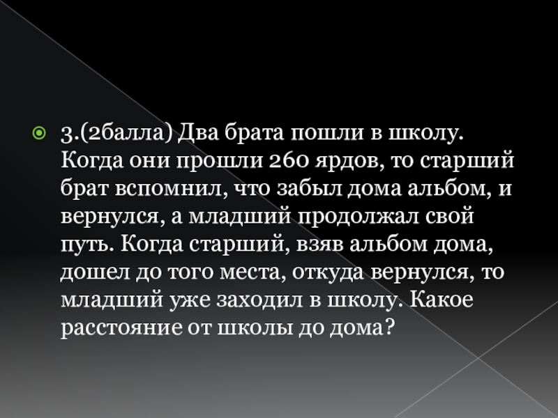 Слайд 263.(2балла) Два брата пошли в школу. Когда они прошли 260 ярдов,