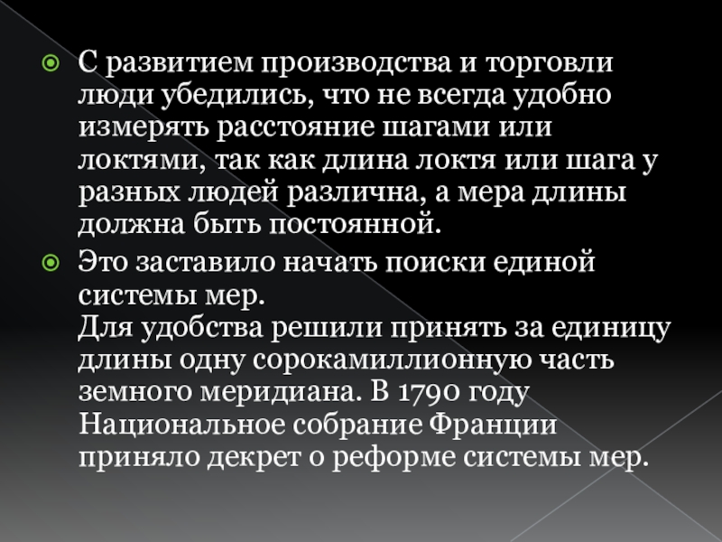 Для удобства решили принять за единицу длины одну сорокамиллионную часть земного меридиана. В 1790 году Национальное собрание Франции приняло декрет о реформе системы мер.