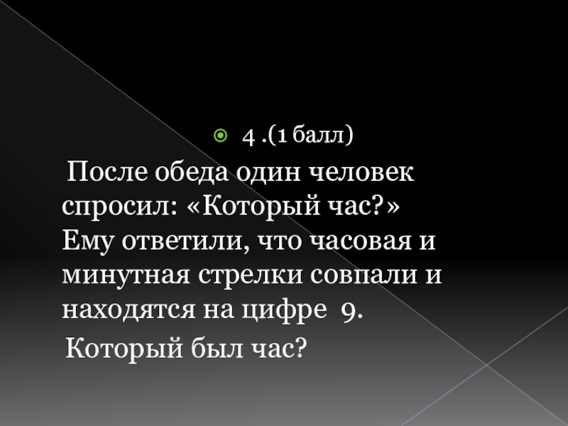 час?» Ему ответили, что часовая и минутная стрелки совпали и находятся на цифре 9.