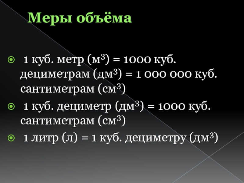 1 куб. метр (м3) = 1000 куб. дециметрам (дм3)