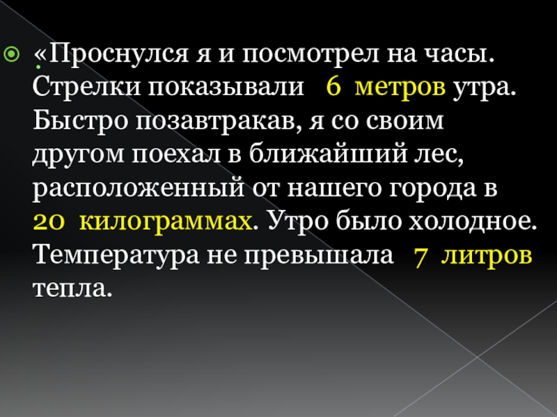 метров утра. Быстро позавтракав, я со своим другом поехал в ближайший лес, расположенный от нашего города в 20 килограммах. Утро было холодное. Температура не превышала 7 литров тепла.