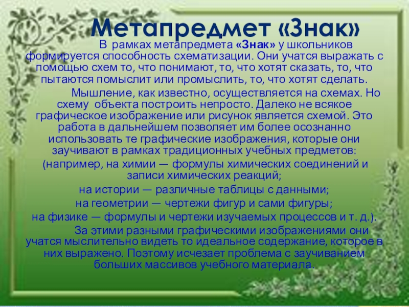 метапредмета «Знак» у школьников формируется способность схематизации. Они учатся выражать с помощью схем то, что понимают, то, что хотят сказать, то, что пытаются помыслит или промыслить, то, что хотят сделать.