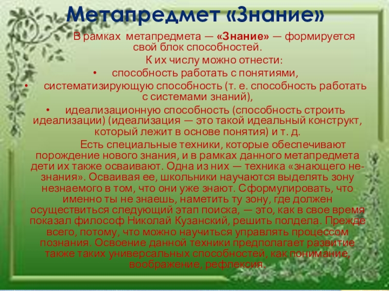 Есть специальные техники, которые обеспечивают порождение нового знания, и в рамках данного метапредмета дети их также осваивают. Одна из них — техника «знающего не-знания». Осваивая ее, школьники научаются выделять зону незнаемого в том, что они уже знают. Сформулировать, что именно ты не знаешь, наметить ту зону, где должен осуществиться следующий этап поиска, — это, как в свое время показал философ Николай Кузанский, решить полдела. Прежде всего, потому, что можно научиться управлять процессом познания. Освоение данной техники предполагает развитие также таких универсальных способностей, как понимание, воображение, рефлексия.