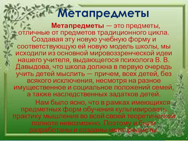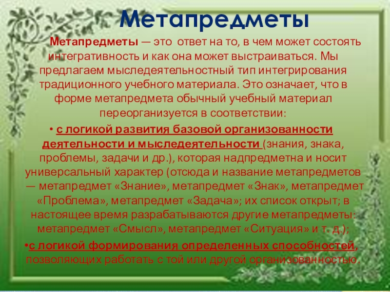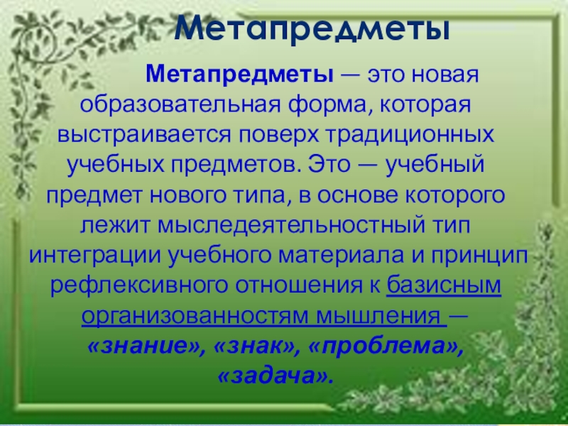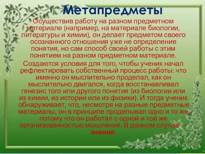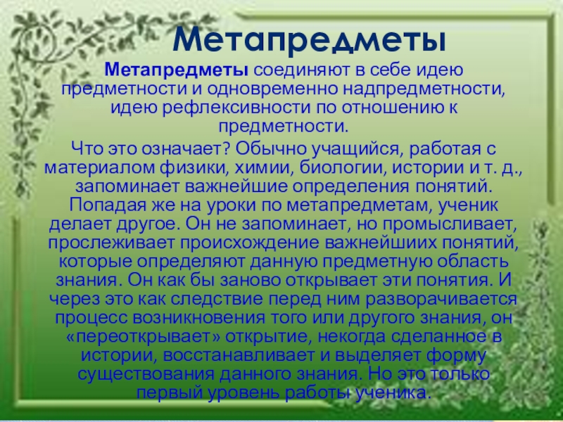 Метапредметы соединяют в себе идею предметности и одновременно надпредметности, идею рефлексивности