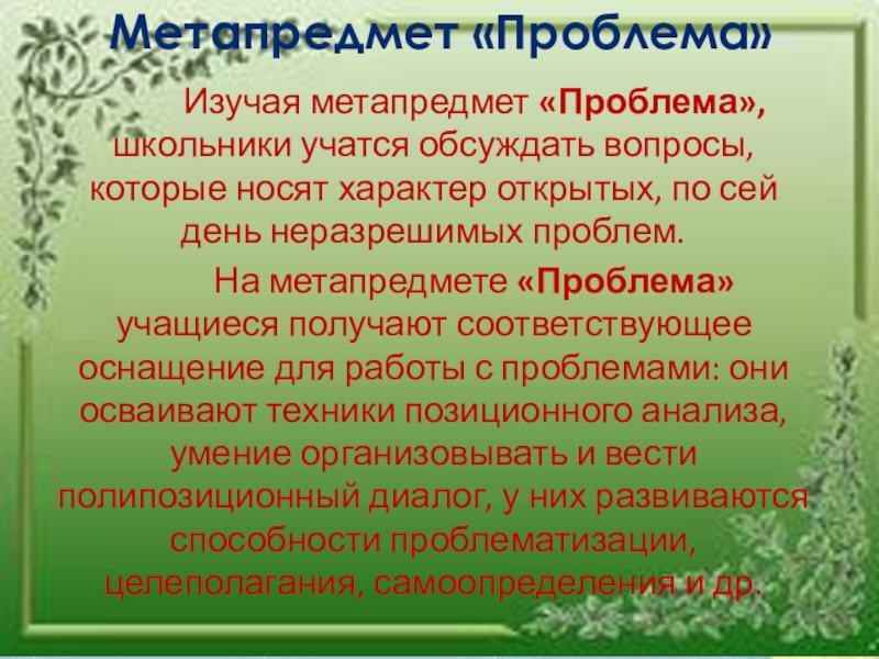 На метапредмете «Проблема» учащиеся получают соответствующее оснащение для работы с проблемами: они осваивают техники позиционного анализа, умение организовывать и вести полипозиционный диалог, у них развиваются способности проблематизации, целеполагания, самоопределения и др.