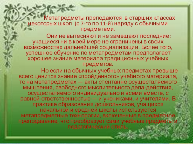 Но если на обычных учебных предметах превыше всего ценится знание «пройденного» учебного материала, то на метапредметах — акты спонтанно осуществляемого мышления, свободного мыслительного дела-действия, осуществляемого индивидуально и всеми вместе, с равной ответственностью — и учениками, и учителями. В практике образования дошкольников, учащихся начальной и средней школы используются метапредметные технологии, включенные в предметное преподавание, что преобразует сами учебные предметы и педагогический стиль.