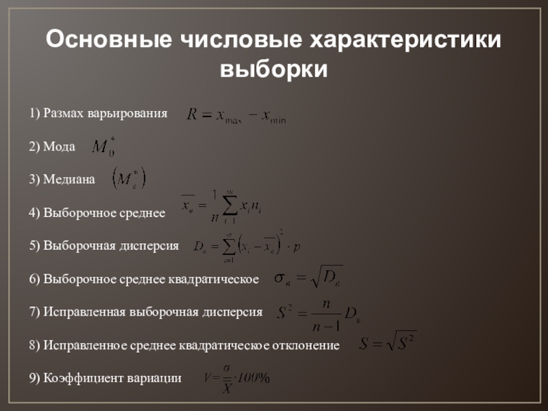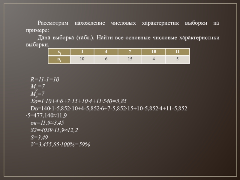 Слайд 13Рассмотрим нахождение числовых характеристик выборки на примере: