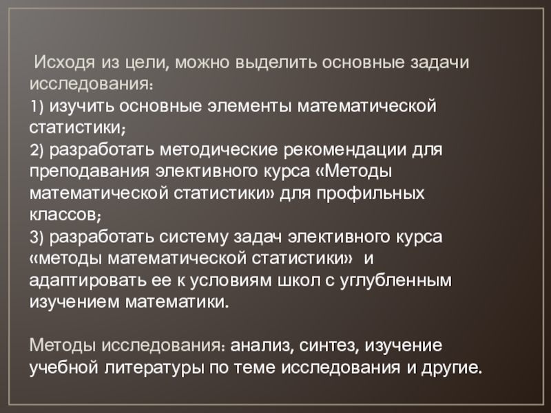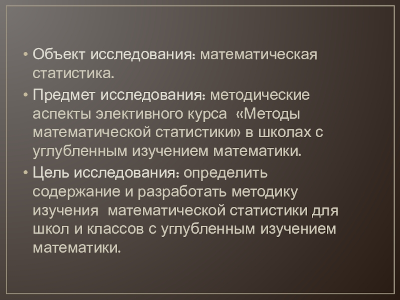 Цель исследования: определить содержание и разработать методику изучения математической статистики для школ и классов с углубленным изучением математики.