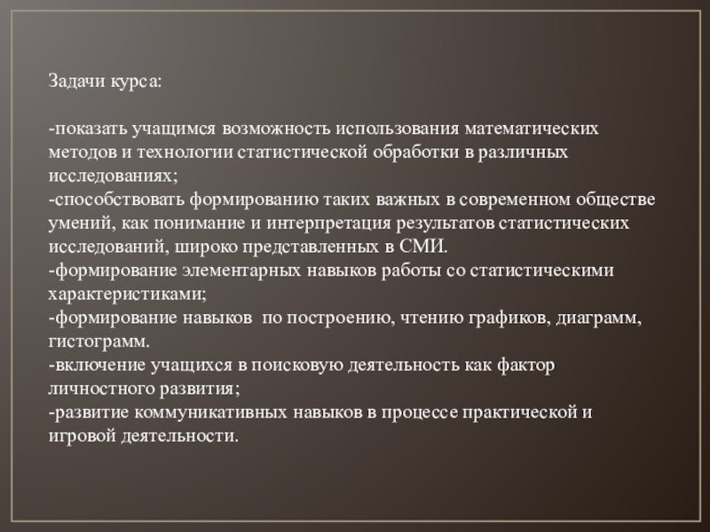 -способствовать формированию таких важных в современном обществе умений, как понимание и интерпретация результатов статистических исследований, широко представленных в СМИ.