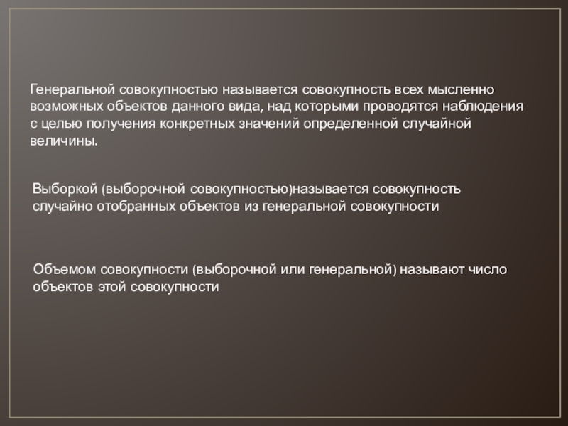 Слайд 7Генеральной совокупностью называется совокупность всех мысленно возможных объектов данного вида, над