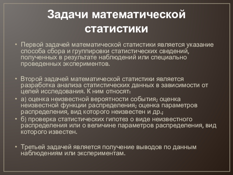 Второй задачей математической статистики является разработка анализа статистических данных в зависимости от целей исследования. К ним относят:
