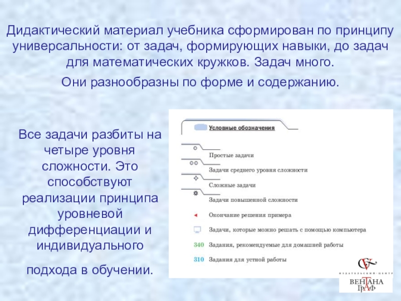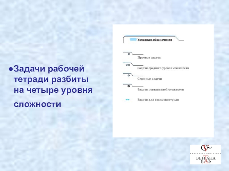 Все задачи разбиты на четыре уровня сложности. Это способствуют реализации принципа уровневой дифференциации и индивидуального подхода в обучении.