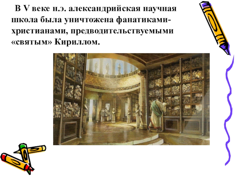 Слайд 5 В V веке н.э. александрийская научная школа была уничтожена