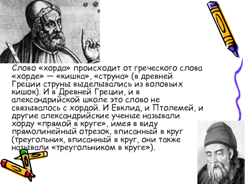 «струна» (в древней Греции струны выделывались из воловьих кишок). И в Древней Греции, и в александрийской школе это слово не связывалось с хордой. И Евклид, и Птолемей, и другие александрийские ученые называли хорду «прямой в круге», имея в виду прямолинейный отрезок, вписанный в круг (треугольник, вписанный в круг, они также называли «треугольником в круге»).