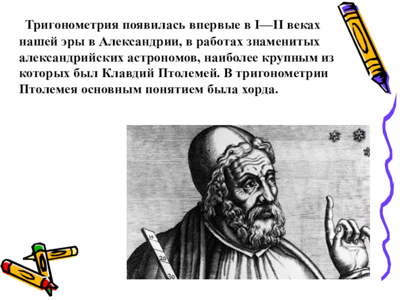 Александрии, в работах знаменитых александрийских астрономов, наиболее крупным из которых был Клавдий Птолемей. В тригонометрии Птолемея основным понятием была хорда.