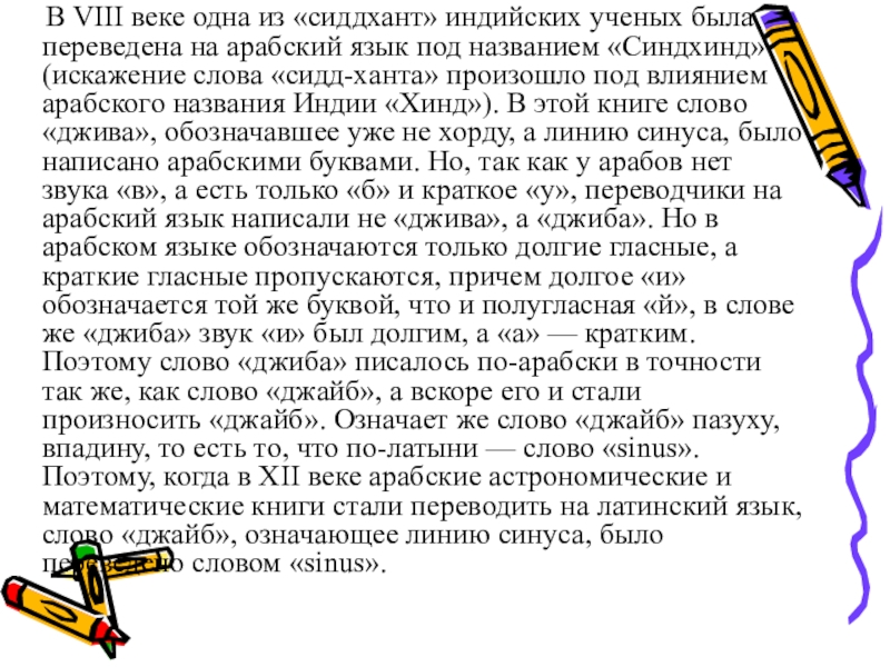была переведена на арабский язык под названием «Синдхинд» (искажение слова «сидд-ханта» произошло под влиянием арабского названия Индии «Хинд»). В этой книге слово «джива», обозначавшее уже не хорду, а линию синуса, было написано арабскими буквами. Но, так как у арабов нет звука «в», а есть только «б» и краткое «у», переводчики на арабский язык написали не «джива», а «джиба». Но в арабском языке обозначаются только долгие гласные, а краткие гласные пропускаются, причем долгое «и» обозначается той же буквой, что и полугласная «й», в слове же «джиба» звук «и» был долгим, а «а» — кратким. Поэтому слово «джиба» писалось по-арабски в точности так же, как слово «джайб», а вскоре его и стали произносить «джайб». Означает же слово «джайб» пазуху, впадину, то есть то, что по-латыни — слово «sinus». Поэтому, когда в XII веке арабские астрономические и математические книги стали переводить на латинский язык, слово «джайб», означающее линию синуса, было переведено словом «sinus».