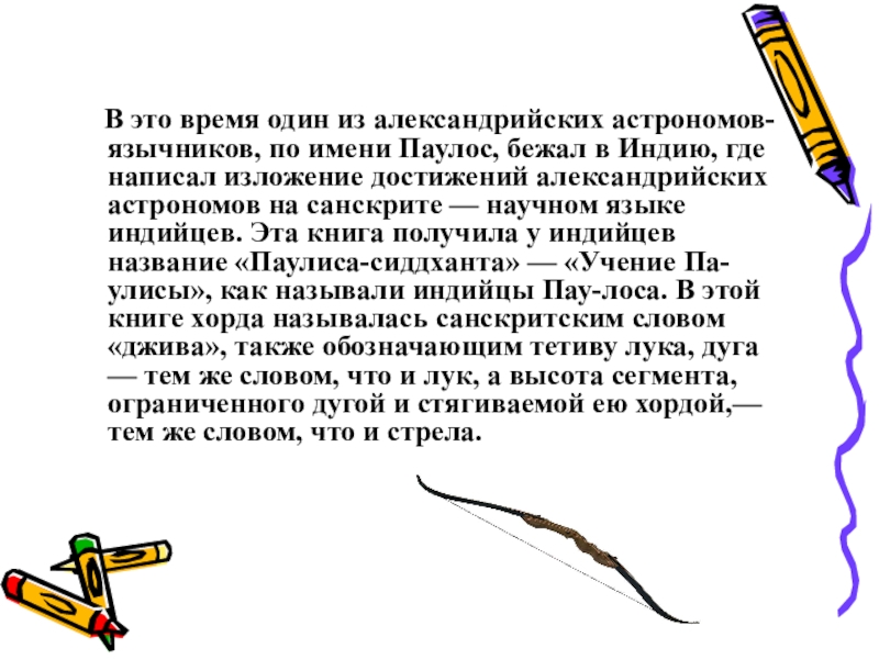 Паулос, бежал в Индию, где написал изложение достижений александрийских астрономов на санскрите — научном языке индийцев. Эта книга получила у индийцев название «Паулиса-сиддханта» — «Учение Па-улисы», как называли индийцы Пау-лоса. В этой книге хорда называлась санскритским словом «джива», также обозначающим тетиву лука, дуга — тем же словом, что и лук, а высота сегмента, ограниченного дугой и стягиваемой ею хордой,— тем же словом, что и стрела.