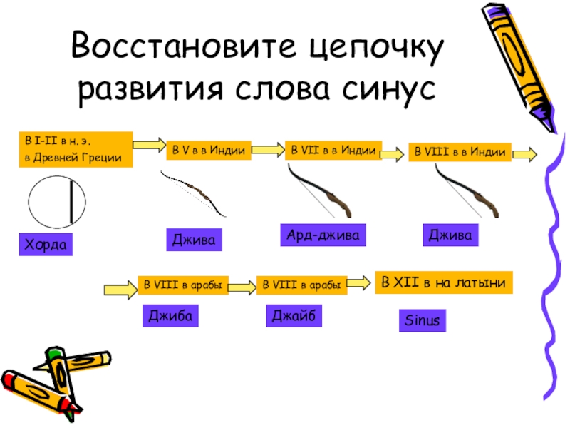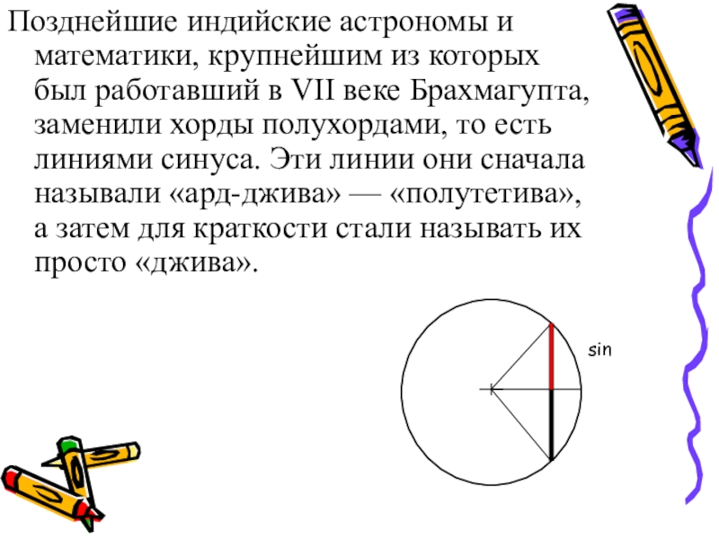 VII веке Брахмагупта, заменили хорды полухордами, то есть линиями синуса. Эти линии они сначала называли «ард-джива» — «полутетива», а затем для краткости стали называть их просто «джива».