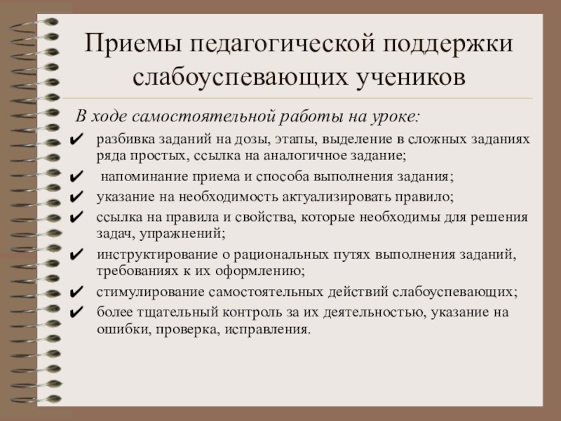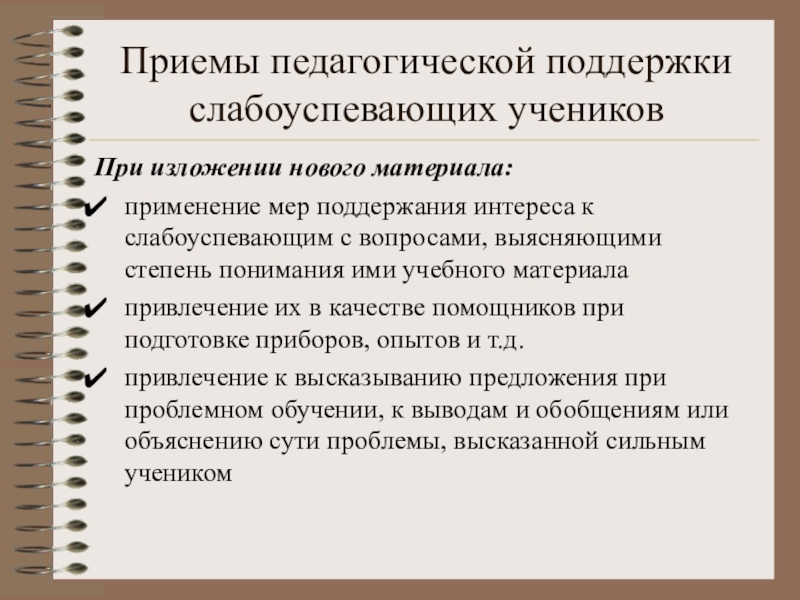 Слайд 13Приемы педагогической поддержки слабоуспевающих учеников