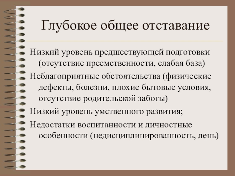 (физические дефекты, болезни, плохие бытовые условия, отсутствие родительской заботы)