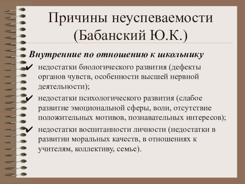недостатки опыта влияния школы (недостатки процесса обучения, учебных пособий и т.д., воспитательных воздействий);
