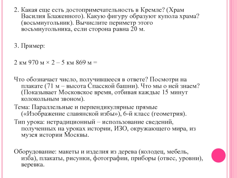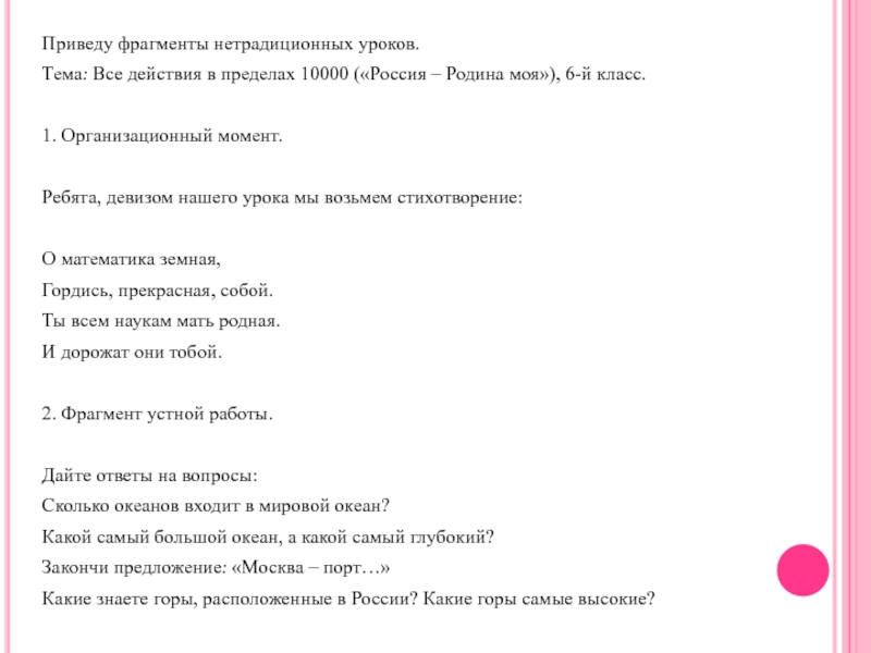 Этих же целей помогают достичь нетрадиционные уроки математики, связанные с историей, географией, трудовым обучением, естествознанием.
