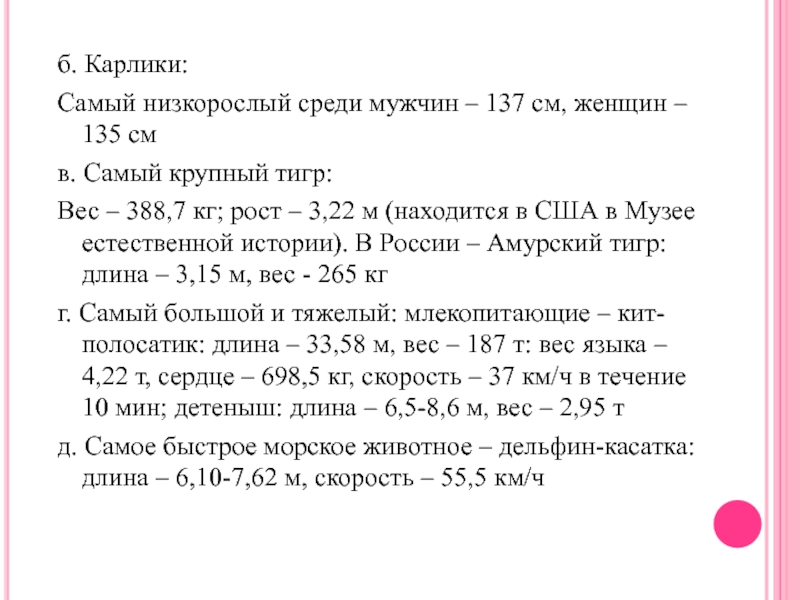 г. Самый большой и тяжелый: млекопитающие – кит-полосатик: длина – 33,58 м, вес – 187 т: вес языка – 4,22 т, сердце – 698,5 кг, скорость – 37 км/ч в течение 10 мин; детеныш: длина – 6,5-8,6 м, вес – 2,95 т