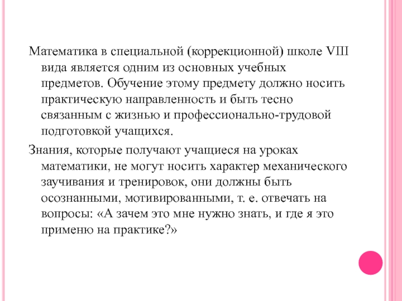 Слайд 2Математика в специальной (коррекционной) школе VIII вида является одним из основных