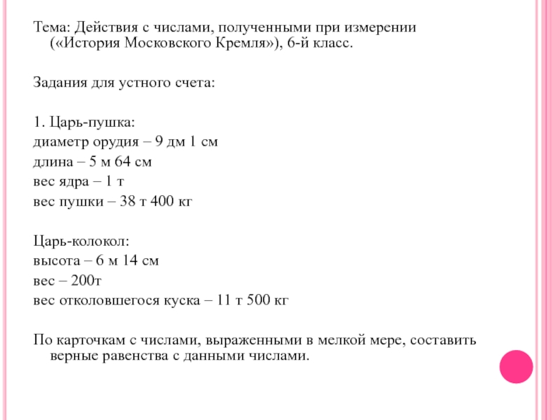 Слайд 12Тема: Действия с числами, полученными при измерении («История Московского Кремля»), 6-й