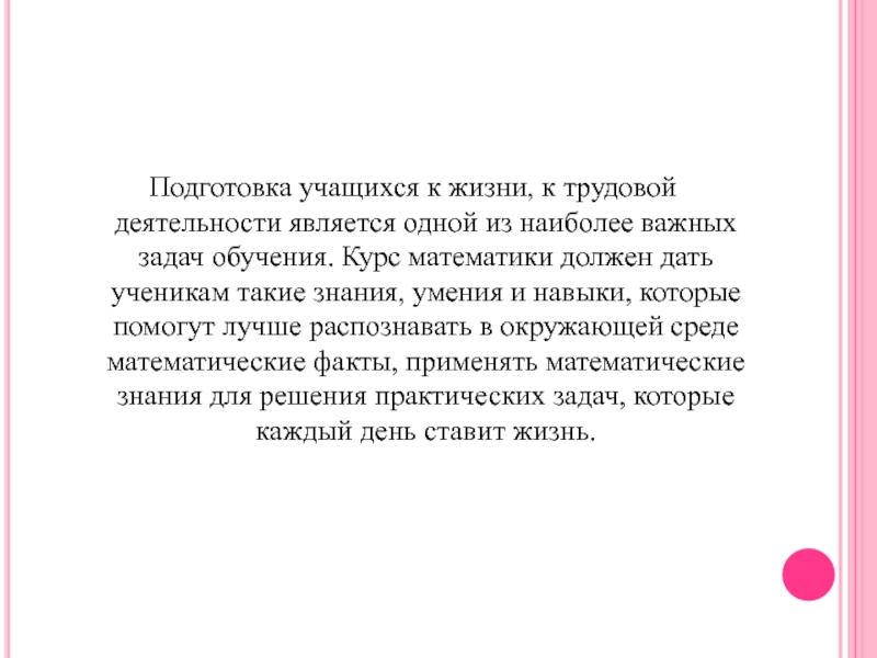 важных задач обучения. Курс математики должен дать ученикам такие знания, умения и навыки, которые помогут лучше распознавать в окружающей среде математические факты, применять математические знания для решения практических задач, которые каждый день ставит жизнь.