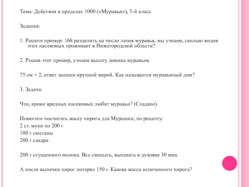 Слайд 11Тема: Действия в пределах 1000 («Муравьи»), 5-й класс.