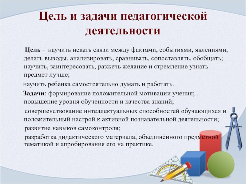 связи между фактами, событиями, явлениями, делать выводы, анализировать, сравнивать, сопоставлять, обобщать; научить, заинтересовать, разжечь желание и стремление узнать предмет лучше;