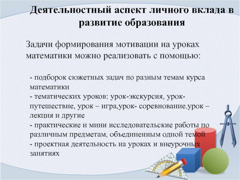 Слайд 10Деятельностный аспект личного вклада педагога в развитие образование
