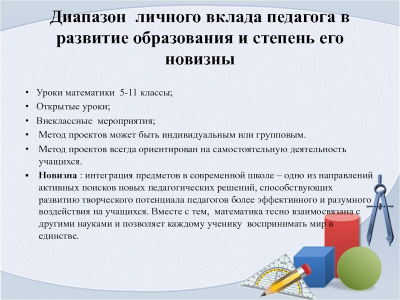 Слайд 11Диапазон личного вклада педагога в развитие образования и степень его новизны