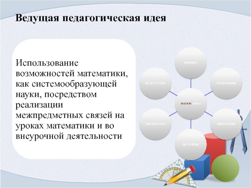 Новизна : интеграция предметов в современной школе – одно из направлений активных поисков новых педагогических решений, способствующих развитию творческого потенциала педагогов более эффективного и разумного воздействия на учащихся. Вместе с тем, математика тесно взаимосвязана с другими науками и позволяет каждому ученику воспринимать мир в единстве.