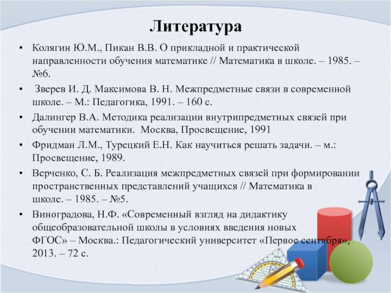 Далингер В.А. Методика реализации внутрипредметных связей при обучении математики. Москва, Просвещение, 1991