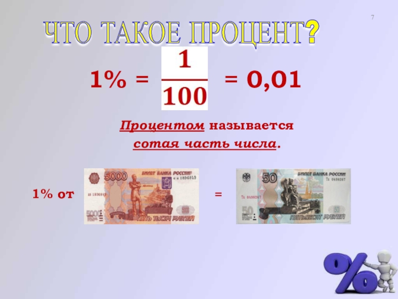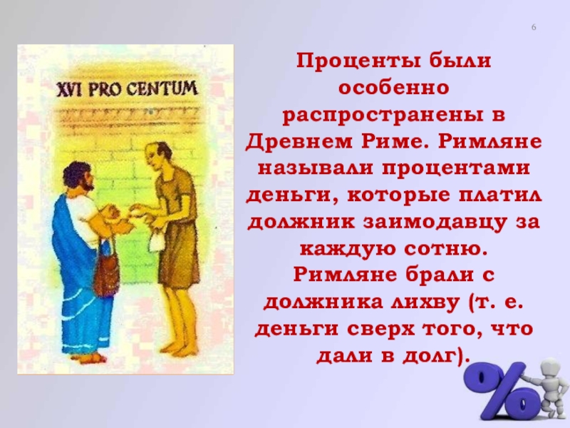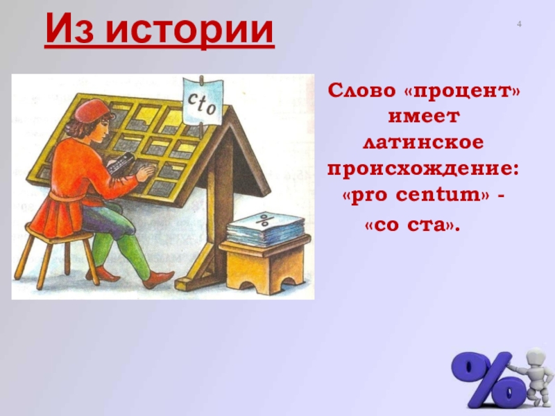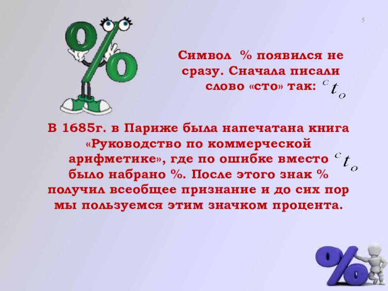 В 1685г. в Париже была напечатана книга «Руководство по коммерческой арифметике», где по ошибке вместо было набрано . После этого знак получил всеобщее признание и до сих пор мы пользуемся этим значком процента.