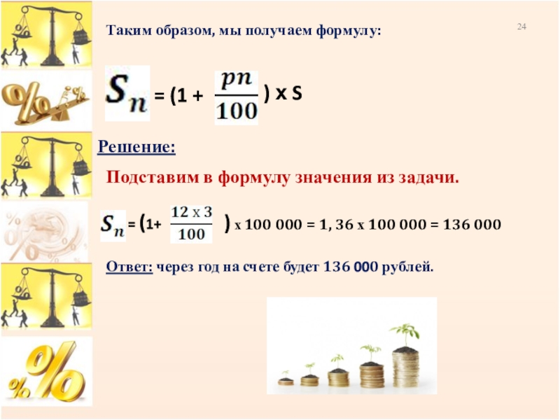 Банк начисляет 12 % годовых от внесенной суммы. Сумма вклада равна 100 000 рублей. Какая сумма будет на счете клиента банка через 3 года?
