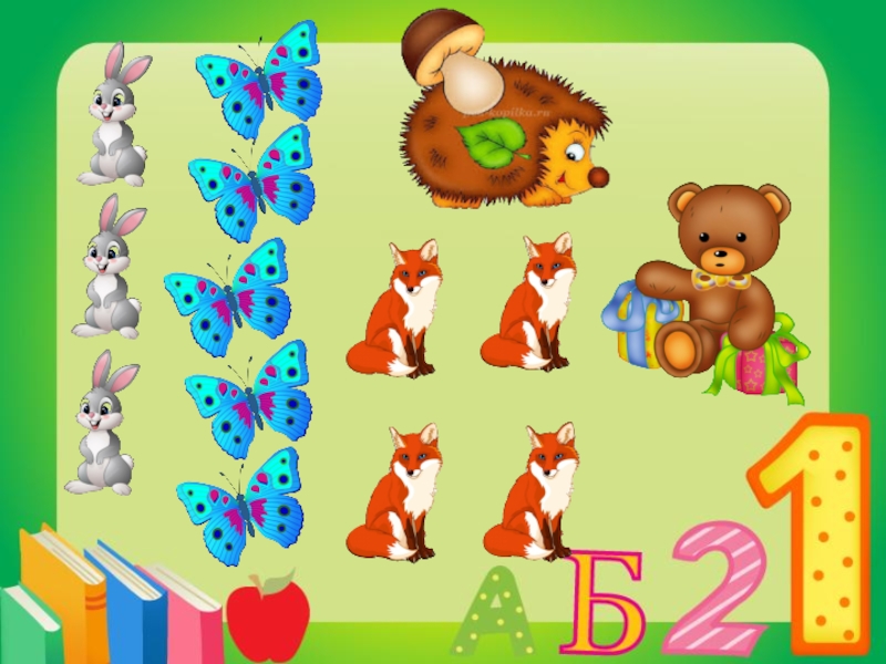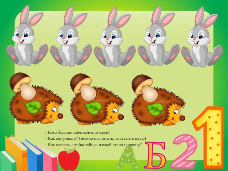 - Кого больше зайчиков или ежей?- Как мы узнали? (можно посчитать, составить пары)- Как сделать, чтобы зайцев