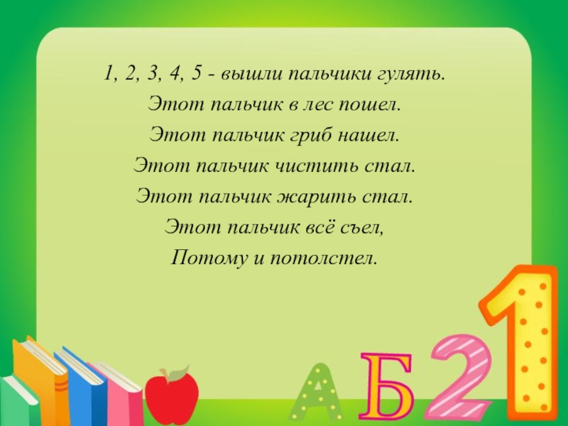1, 2, 3, 4, 5 - вышли пальчики гулять.Этот пальчик в лес пошел.Этот пальчик гриб нашел.Этот пальчик