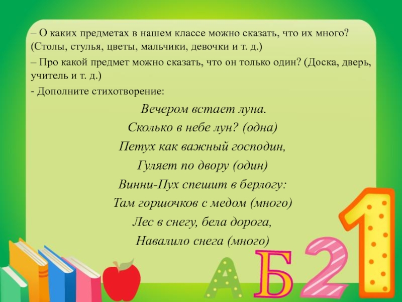 – О каких предметах в нашем классе можно сказать, что их много? (Столы, стулья, цветы, мальчики, девочки