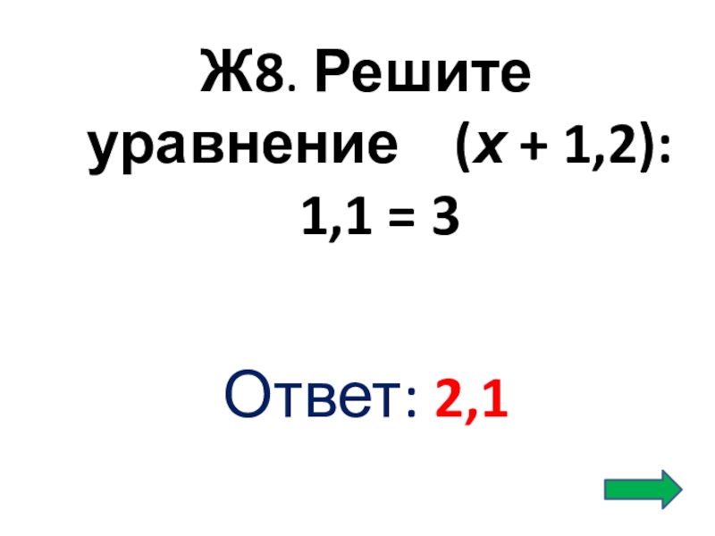 Слайд 40Ж8. Решите уравнение (х + 1,2): 1,1 = 3