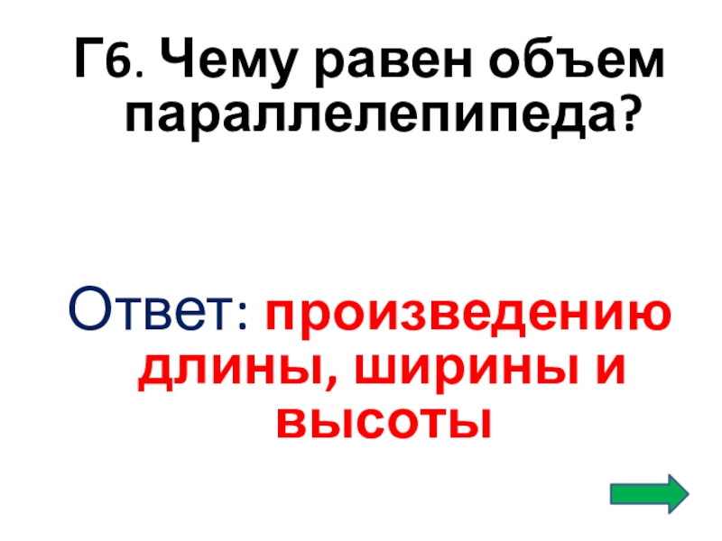 Г6. Чему равен объем параллелепипеда? Ответ: произведению длины, ширины и высоты