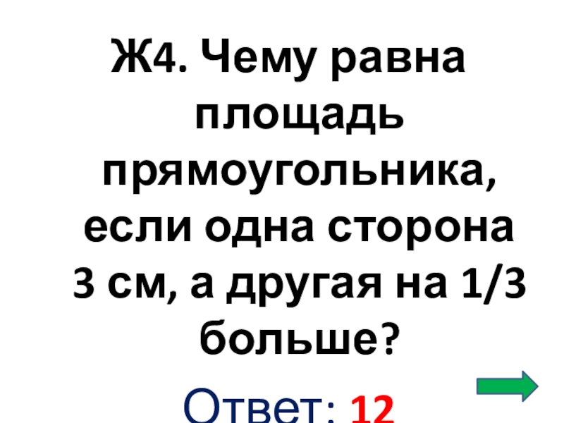 Ж4. Чему равна площадь прямоугольника, если одна сторона 3 см, а другая на 1/3 больше? Ответ: 12