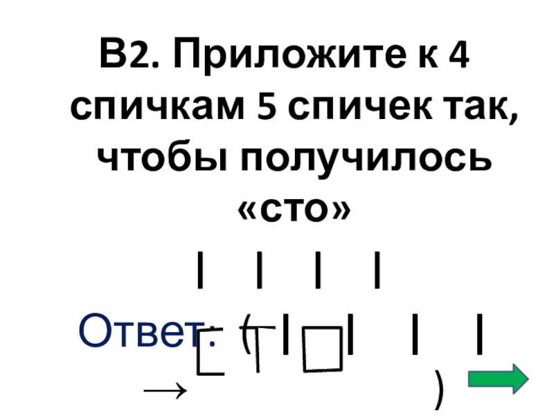 Слайд 14В2. Приложите к 4 спичкам 5 спичек так, чтобы получилось «сто»