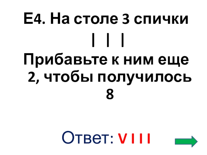 Е4. На столе 3 спички | | |  Прибавьте к ним еще 2, чтобы получилось 8Ответ: