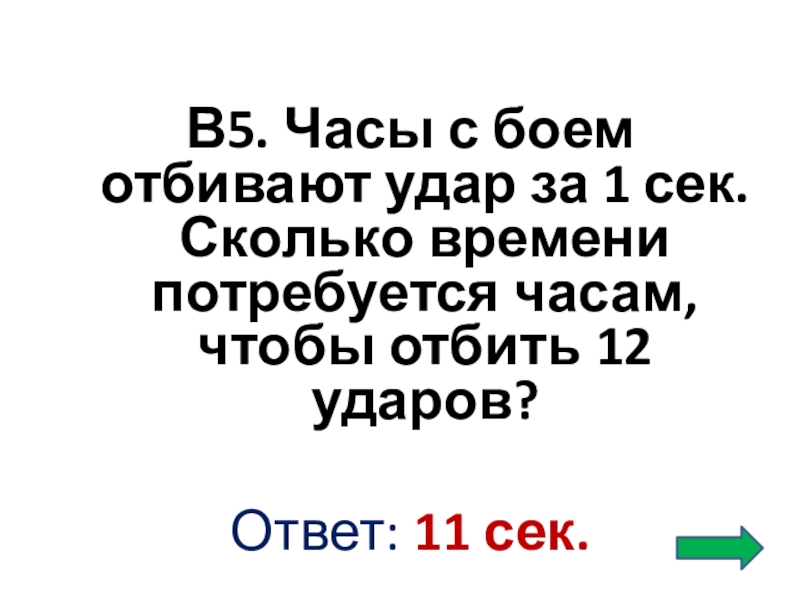 В5. Часы с боем отбивают удар за 1 сек. Сколько времени потребуется часам, чтобы отбить 12 ударов?Ответ: