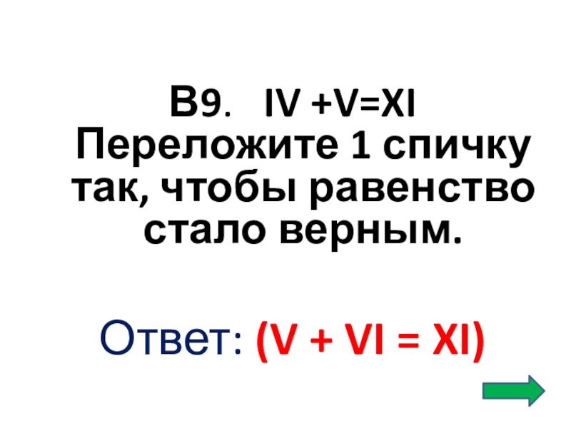 В9. IV +V=XI Переложите 1 спичку так, чтобы равенство