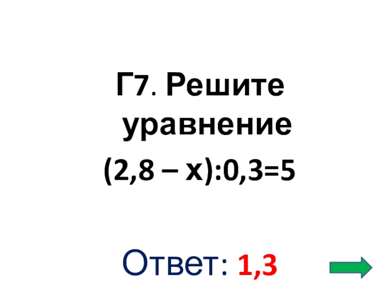 Г7. Решите уравнение (2,8 – х):0,3=5 Ответ: 1,3